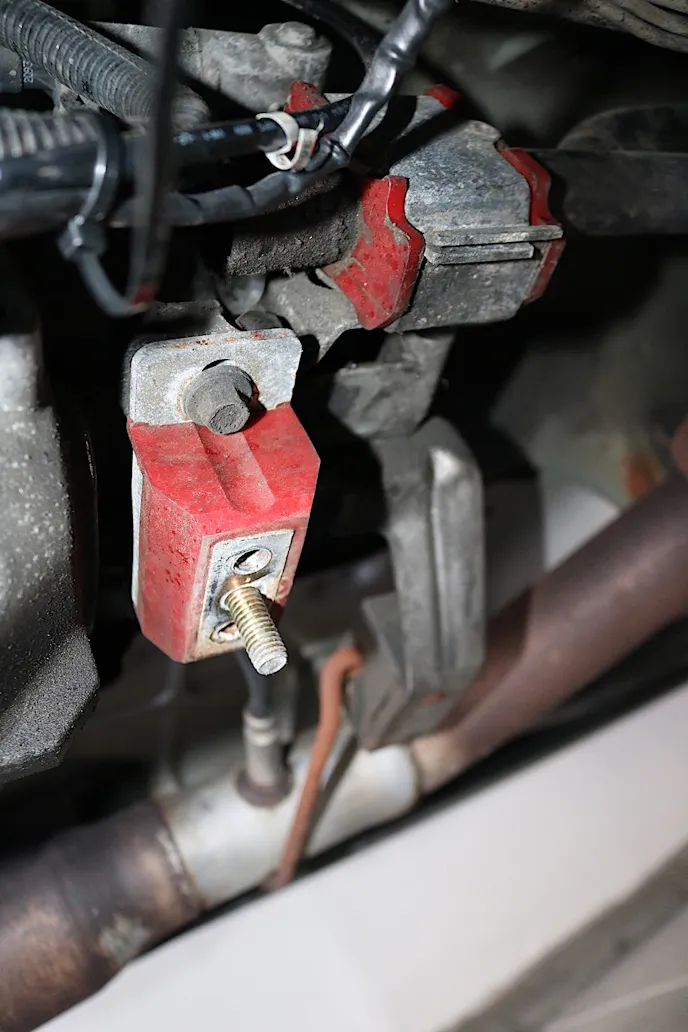 Here you can see the torque arm mount that needs to be disconnected before the transmission can be removed from the car. Getting the arm bolted back up can be a pain but with some persistence it will go back together.