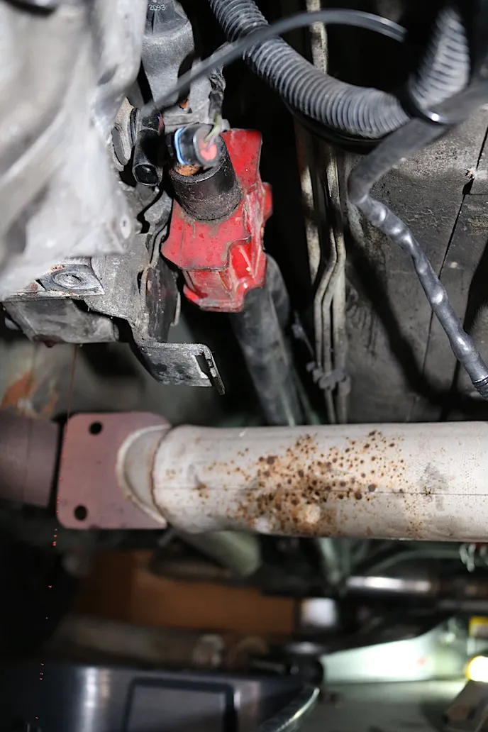 Once the shifter is out of the way, make sure you cover the hole for the shifter rails with a rag so nothing falls into the transmission. At this point, we moved under the car to remove the driveshaft. Once the driveshaft is out of the way, it’s time to remove the transmission crossmember and torque arm mount. The exhaust hanger for the Y-pipe may also need to be removed and it is bolted to the transmission with three bolts that attach it to the transmission. These were removed next.