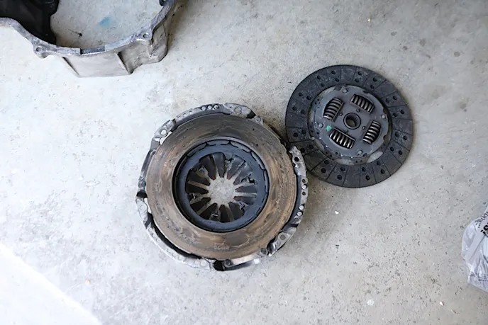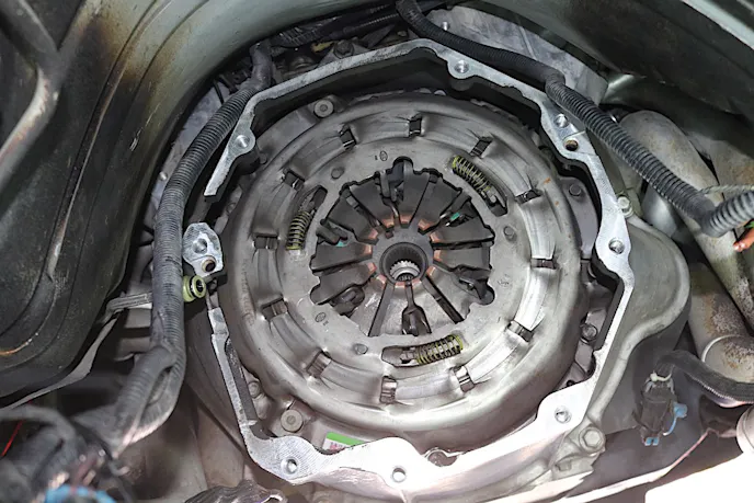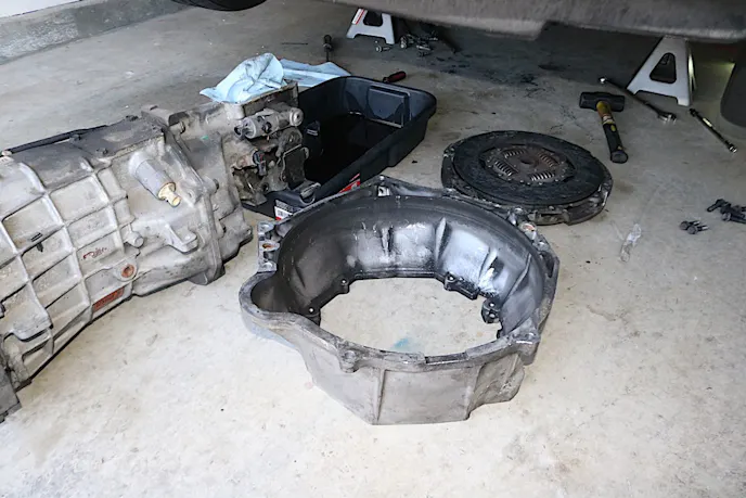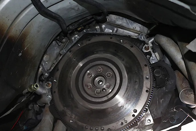 With nothing holding the transmission in, we placed a jack under the transmission and carefully rocked it until it was free. We then lowered it and moved it out of the way. With the transmission out of the car, we could now easily access the eight bellhousing bolts. After removing them, the clutch was removed after loosening the six bolts that secure it to the flywheel.