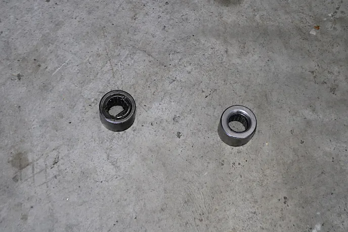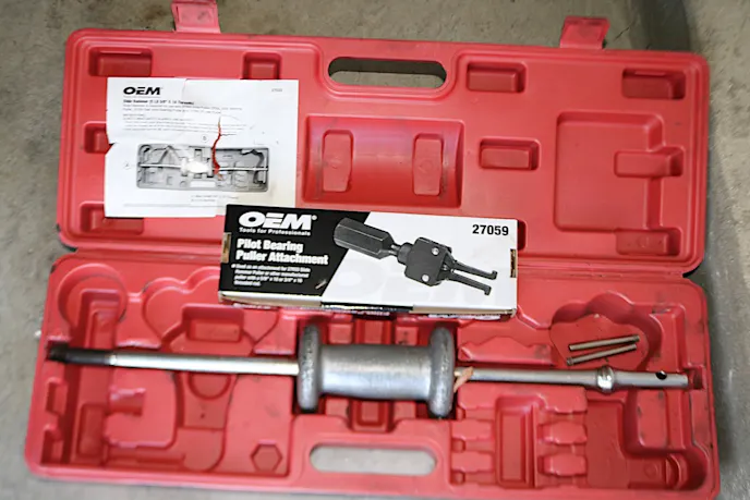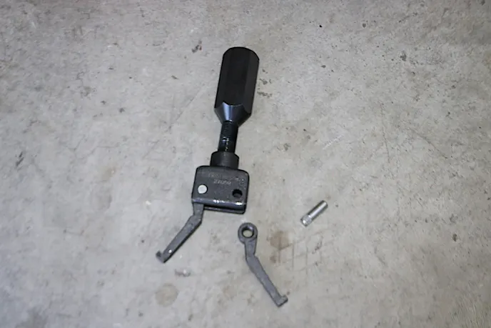 Here you can see the tools we used to remove the pilot bearing. After pushing the pin out of the tool, you can then insert the arms one at a time into the pilot bearing, otherwise there wouldn't be enough room for both arms to fit through the opening simultaneously. Once both arms were in place, we reinstalled the arm and pin to the tool. With the tool firmly locked behind the pilot bearing, we threaded on the slide hammer and pulled the old bearing.