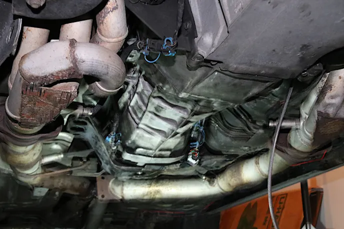 Next, we made sure all of the electrical connections to the transmission were free and that our wiring harness was free of the loom holders. Once we were sure nothing was holding the transmission to the car, other than the transmission to bellhousing bolts, we were ready to drop the gearbox.