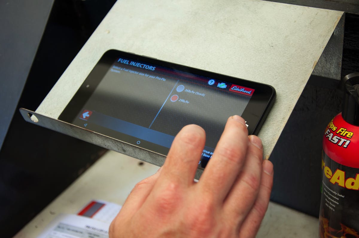 The next step in the process was to set up the ECU. Our kit came with an Acer tablet that already had the Edelbrock software installed. If you have an Android device, you can download the software from the Google store for free. Tommy turned on the ignition for the ECU, and we hit the connect engine icon at the top right of the screen. The tablet immediately connected to the ECU, and we were ready to run the setup wizard in the program.