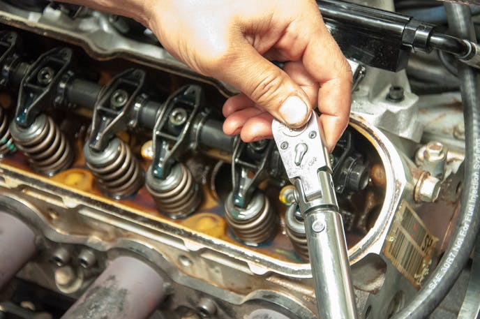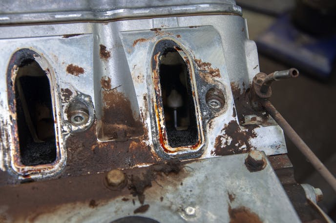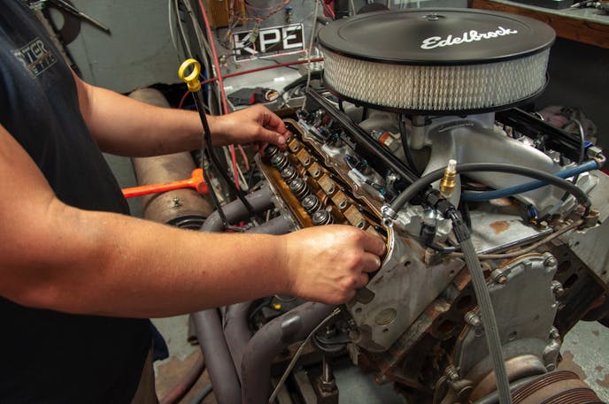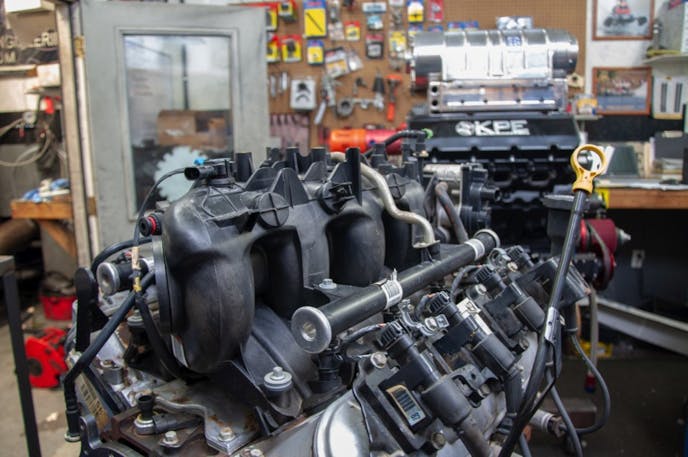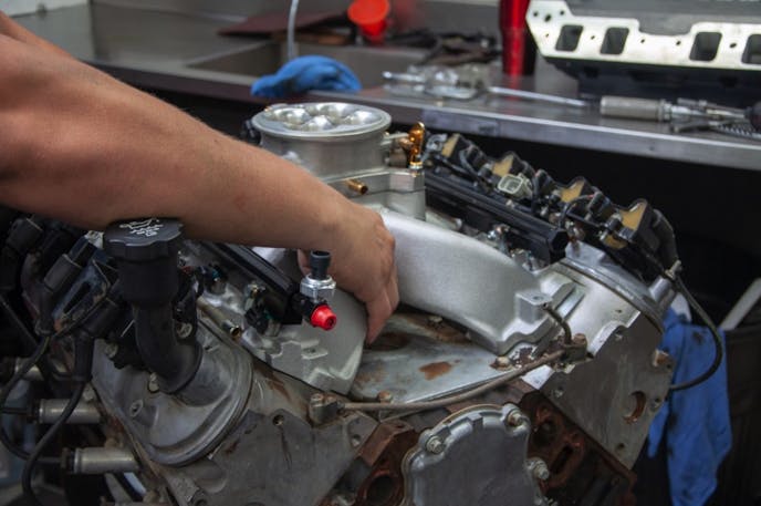After the engine was set up on the dyno cart, we removed the factory composite intake on the engine. With the intake manifold off, it was apparent that the 5.3 had a pretty rough life and was remarkably dirty. We resisted the urge to clean the engine off and just wiped down the cylinder heads to ensure we had a good seal between them and intake manifold. We then dropped the Pro-Flo 4 intake on the 5.3 and bolted it down with zero problems. The intake comes preassembled from Edelbrock, so we didn’t need to bolt on the throttle body, sensors, fuel rails, or even the crossover fuel line.