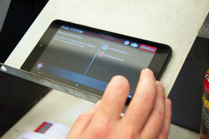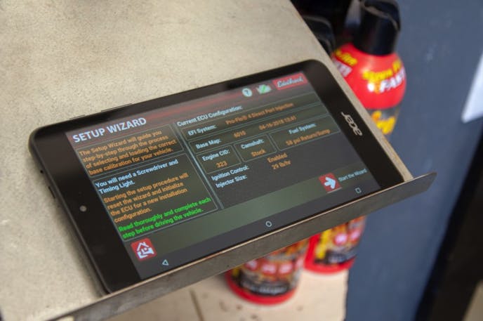 The next step in the process was to set up the ECU. Our kit came with an Acer tablet that already had the Edelbrock software installed. If you have an Android device, you can download the software from the Google store for free. Tommy turned on the ignition for the ECU, and we hit the connect engine icon at the top right of the screen. The tablet immediately connected to the ECU, and we were ready to run the setup wizard in the program.