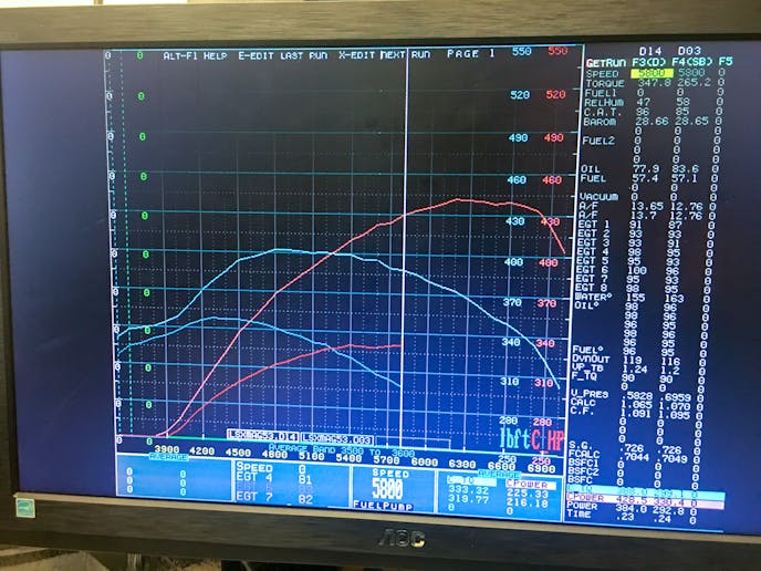 By now, Tommy had gained some confidence in the Pro-Flo 4 unit. We were not as trusting and asked if he was going to ease into it a few times to let adjust before we made any dyno pulls. Tommy replied, “Nope! Shut the door and let’s make some pulls!” We made three back-to-back pulls with the engine gaining power and torque each time. Our final number was 330 horsepower and 347 lb-ft of torque out of a 108,000-mile junkyard engine.