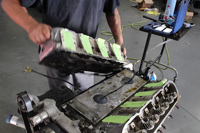 As we were lowering the engine and transmission out of the chassis, we happened to notice some dried coolant on the side of the block. This seemed to indicate that the head gasket on the passenger side had been leaking, confirming that we made the right decision to remove the engine.