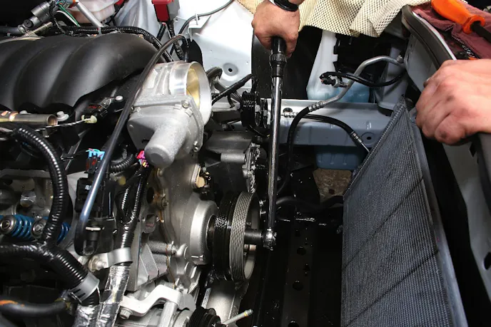 Once the new Fluidampr unit was fully installed, the A/C drive belt was walked back on to the rear damper and A/C compressor pulleys. The accessory drive belt was then reinstalled, followed by the equipment that was removed initially to access the damper.