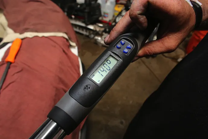 Using a torque wrench, the crew at Cunningham Motorsports then installed a new GM torque-to-yield bolt, torquing it to 37 foot-pounds before using a torque angle meter to tighten the bolt an additional 140 degrees.
