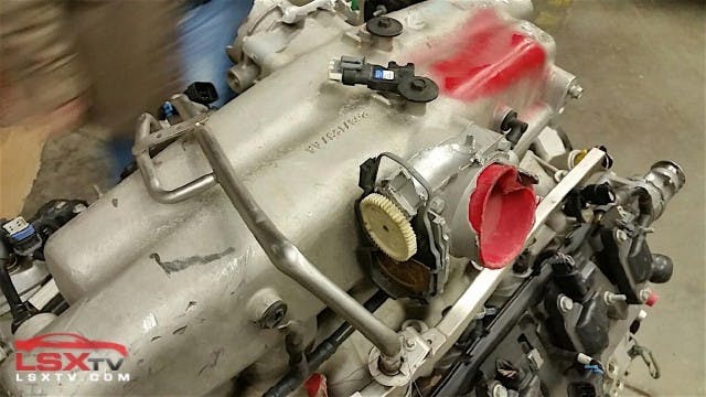 The intake manifold is an interesting piece. In our research regarding the LS V10 that never made it past a few CAD drawings and foam models that engine appeared to wear a low-profile intake manifold similar to what is found on most passenger car LS engines (Corvette, Camaro, G8, etc). This engine however uses what appears to be a unique manifold. The twin throttle-body design feeds each bank individually. Masters says there is no cross-over within the manifold. This would further aide a displacement on demand system in shutting down one bank of the engine completely, including airflow for anything other than cooling purposes, possibly further improving on performance, emissions, and efficiency when running in DOD mode.