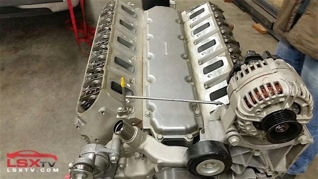 Masters says the rear engine cover is similar if not identical to that of an LS3 engine. The front covers while similar to the LS3 design are unique themselves. The engine however, does utilize a typical LS3-equipped GM truck front engine accessory drive, and was equipped with such when it arrived at KC Maxx, including a LY6 style water pump.