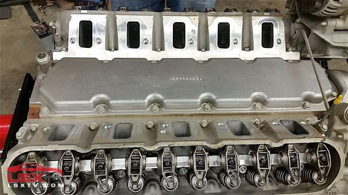 Four knock sensors are located where we’d expect them on any LS engine. The KC Maxx team has found one crankshaft position sensor, although they suspect the design likely utilized two. A custom valley cover was necessary for this application, although a cursory glance could almost mistake it for a typical LS valley cover.