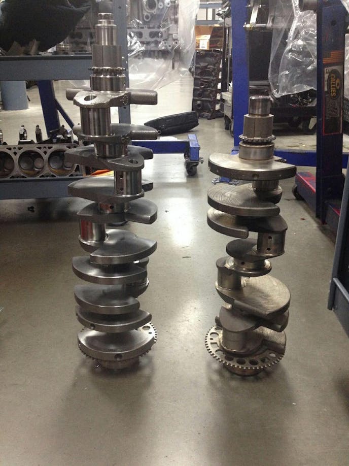 The block utilizes a 4.00-inch bore which is shared with the LS2, LQ4, LQ9, LY6, L76 and 4.00-inch stroke found in the LS7. This puts displacement with 10 cylinders around 455 cubic-inches (7.5-liters).The pistons have reliefs cut in them similar to the OEM design of the LS2, and the shop estimates that the engine should have a compression ratio between 9.8-10.2:1. The crankshaft uses the LSA/CTS-V 8-bolt flex-plate.