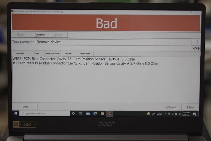 The third adapter Bill Hillock demonstrates in BP Automotive’s LS harness testing process is designed to simulate high resistance in the cam position sensor signal circuit. Unlike a missing or crossed wire, this type of fault is more subtle and can easily go unnoticed during assembly. The company’s testing standard is strict, and any resistance over 5 ohms will trigger a failure in this circuit. To illustrate just how sensitive and accurate the system is, Hillock installs a 5-ohm resistor into the circuit before beginning the test. Once the software runs its check, the results appear instantly on-screen, showing a total resistance of 5.7 ohms in the circuit for pin A at the cam position sensor signal.