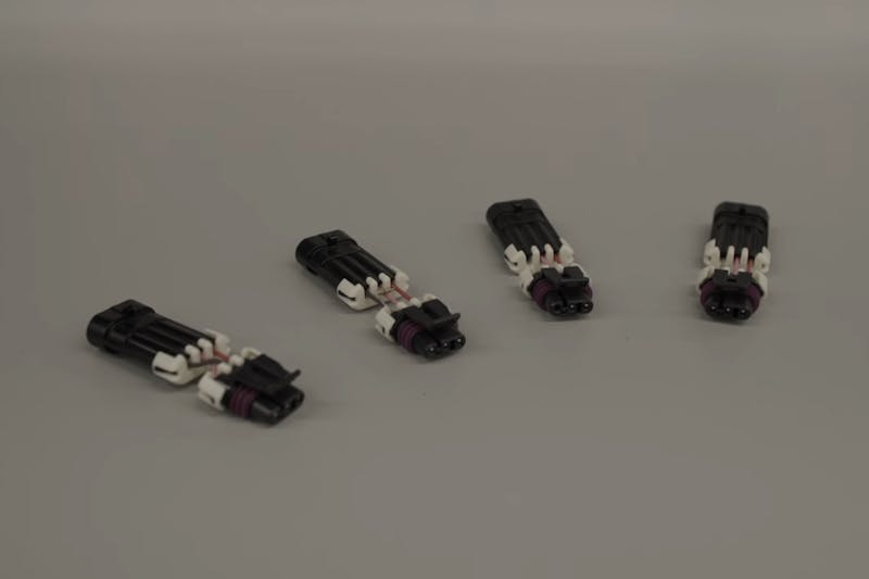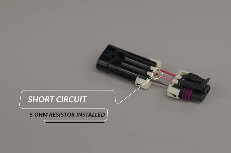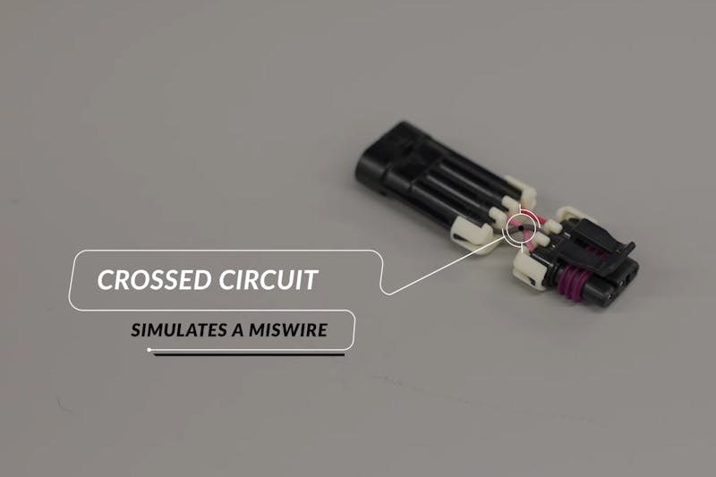 For the final LS harness testing demonstration, Bill connects the fourth and final test adapter, which is designed to simulate a short circuit between pins A and C on the cam position sensor connector. These pins represent the 12-volt reference and sensor signal circuits, two of the most critical paths in the camshaft position sensor circuits that can’t be crossed. When shorted, they create an electrical overlap that could cause erratic sensor readings, ECU faults, or even prevent your LS from running.