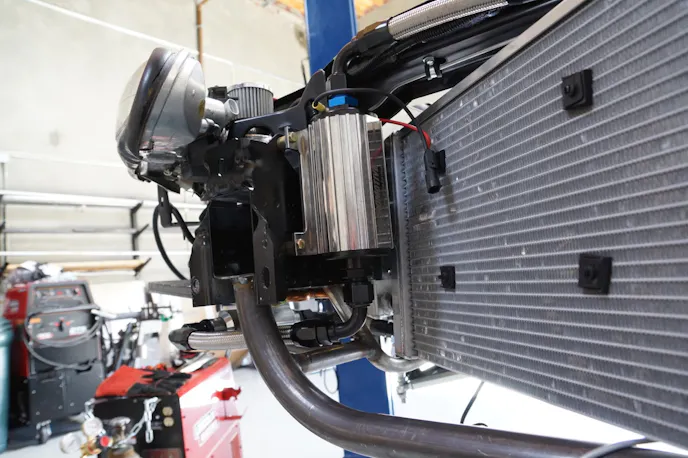 We plumbed in a Pro Series Fuel Filter on each side of the fuel pump - one immediately after the fuel leaves the cell, and another before it goes on to the FPR. You might be thinking that the first filter is too close to the oil cooler, and will heat up the fuel. If his were a street car, we would agree. But the fuel will have plenty of time to cool down between rounds, so we aren't too worried about it, and it made the packaging much simpler up front.