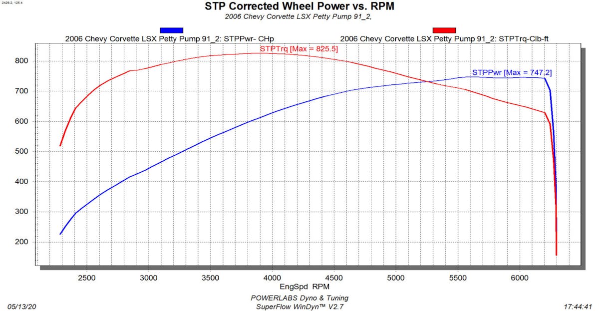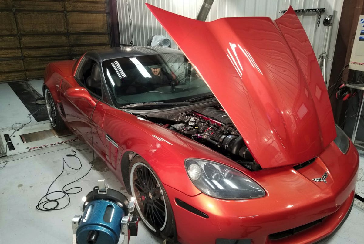 With the car on location at Power Labs Dyno & Tuning, the guys strapped down the C6 and got it ready for a baseline run with 91-octane pump gas. The Corvette has been on the dyno several times in the previous weeks, so there were no surprises. As the Corvette spun the rollers, the car made an impressive 747 horsepower and 825 lb-ft of torque. After the pull, the guys noticed the slightest bit of knock, letting us know we were on edge with our ProCharged pump-gas combination.