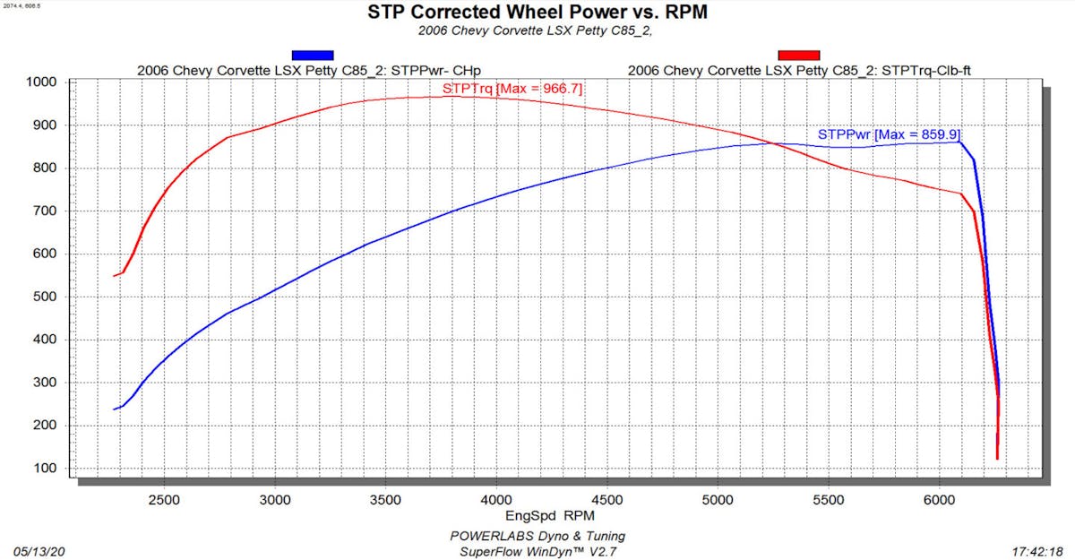 We then emptied the C6 fuel tank and added in the C85 fuel and once again hit the rollers. With some slight tuning changes, our first pull put down 851 horsepower and 940 lb-ft of torque. But we were just getting started. After a few more pulls, the guys were able to get our ProCharged street car to a max of 859 horsepower and 966 lb-ft of torque.