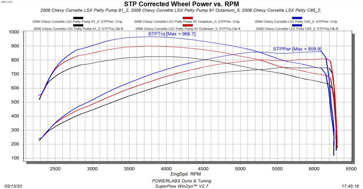 The C85 generated 109 additional horsepower and 141 lb-ft of torque more than we were able to make on just 91 octane gas from the pump. That’s a serious gain only by switching the two fuels.