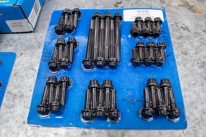 Instead of using the factory OEM engine bolts, we opted for ARP’s LS engine bolt kit (PN 534-9705). This package includes bolts for everything from the oil pan, front and rear cover, water pump, exhaust manifolds, valve covers, and exhaust manifolds. While the factory bolt would have worked for this combination, we wanted something custom. ARP’s black 12-point bolts are a nice touch for our build and a much better bolt than the OEM’s. We used the bolts everywhere we could, including the front and rear covers, oil pan, exhaust manifolds, and the valve covers.