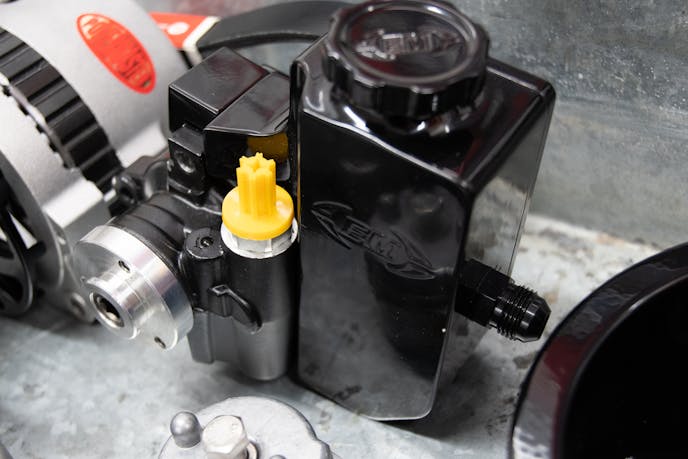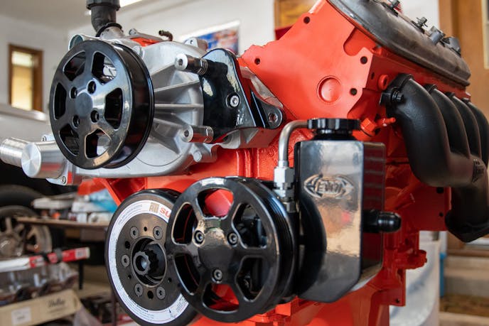 If you’re going for that classic look, the factory accessory drive system doesn’t look the part. While the OEM pieces are robust and reliable, they’re also bulky and less than attractive. To address this problem, we made a call to Eddie Motorsports and ordered one of its S-Drive accessory drive units. This unit is designed to bolt on to the LS family of engines and replaces the factory water pump, power steering pump, alternator, and A/C compressor, if equipped. This product is available in several different combinations and finishes. And While the Raven Series is the most popular choice, for our project, we chose the gloss black combined with a natural finish, meaning all of the accessories are natural cast aluminum, for a 1960’s OEM look.