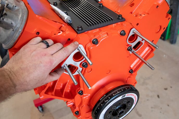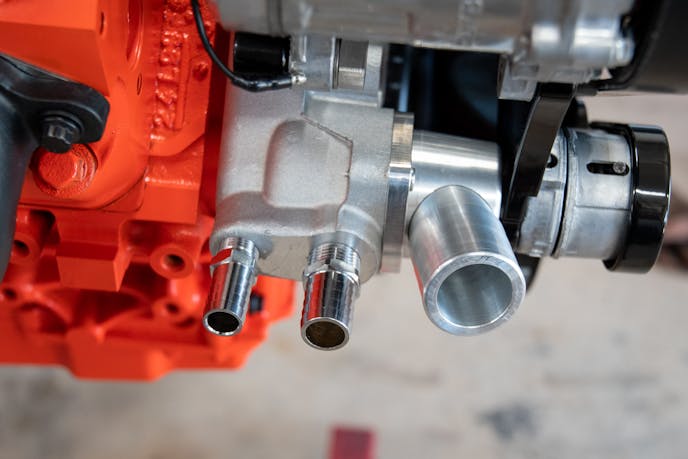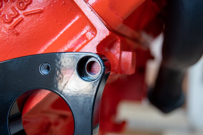 The LS valve covers are not very attractive, even with the coils removed and relocated. To combat this problem, we ordered a set of small-block valve cover adapters from Holley (PN 241-298). Since our units were cast aluminum, we had to paint them Hugger Orange to match the engine. After the paint dried, we swapped out the factory covers for the Holley adapters, which allows us to utilize the old small-block Chevrolet valve covers in place of the OEM units. Another great feature of this setup is that the new valve covers will hide our coil packs.