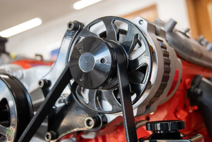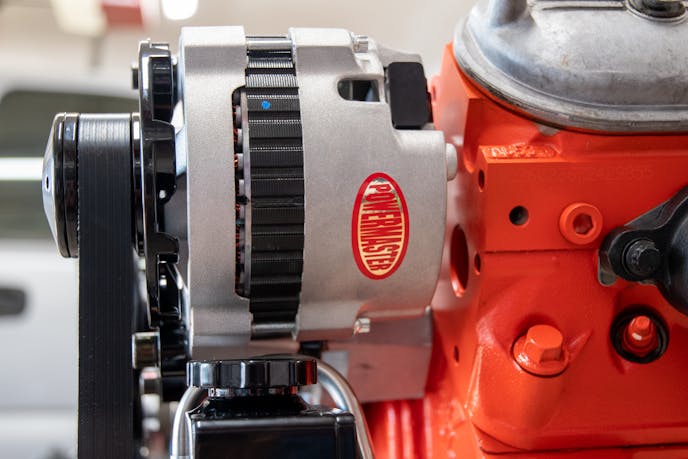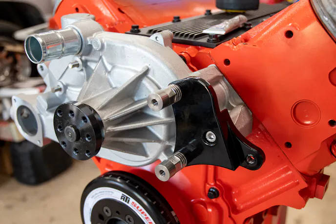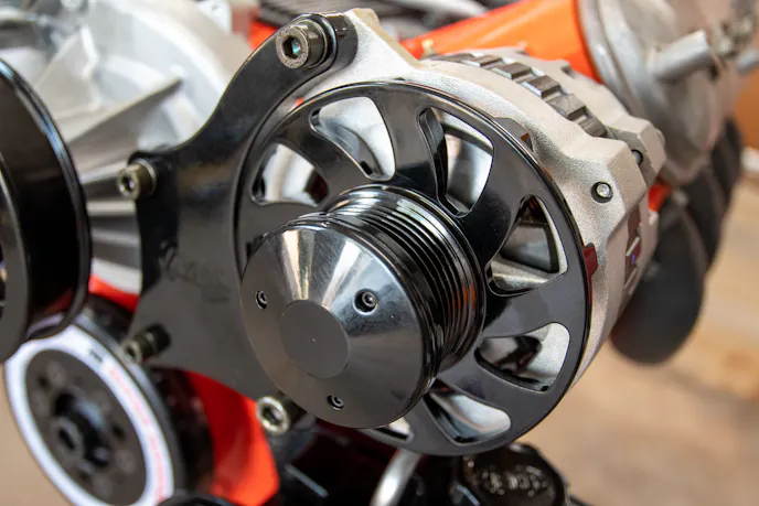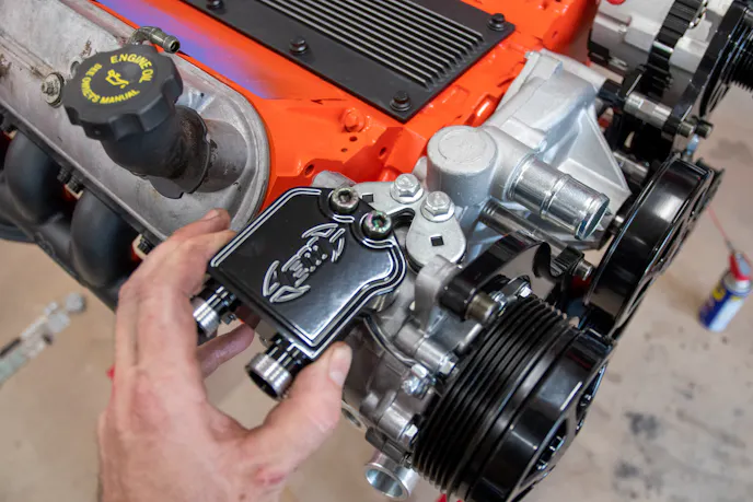 Our next step is to install the brackets for the Powermaster 170 amp alternator. Again, this process is simple, and no modifications were needed. Like the rest of our installation, the billet machined brackets fit the alternator to our LS block perfectly.