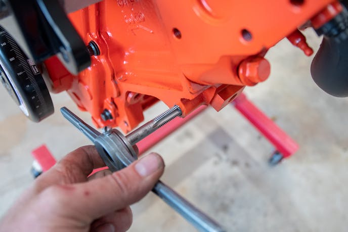 For the installation of the Super Damper, we used an installation tool from ICT Billet. The stud threads into the crankshaft. After it’s inserted and the hub is lined up, attach the washer and nut and use a ratchet to press the hub on the crankshaft. You will then remove the installation tool and connect the Super Damper with the supplied hardware. Then use the provided torque to yield (TTY) LS balancer bolt to secure the super damper. It’s good to note that a used LS balancer bolt should never be reused. Eddie Motorsports knows that’s the case and includes a new TTY bolt and all of the necessary hardware. The rest of the installation is straight forward unless you have a truck block, which we do, but we will get into that a little later.