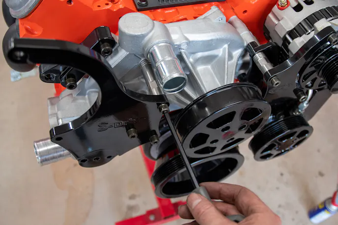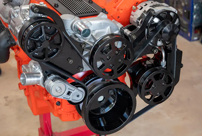 “Our S-Drive is more compact than the factory-style kits. It offers a more modern look in several different finishes and configurations. The S-drive uses all new components, unlike the factory system that may come on your take-out engine. This kit has all new parts, like the tensioner, water pump, alternator, A/C compressor, and power steering pump. By the time you combine these new parts on an old take-off system, you’re close to the price of one of our kits,” Oberhelman explained.