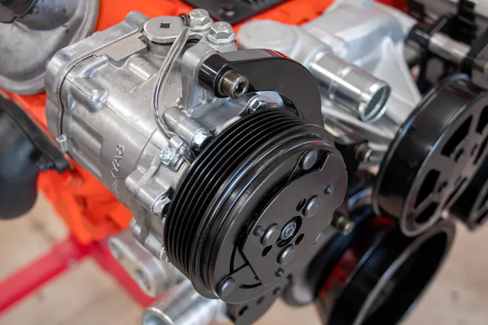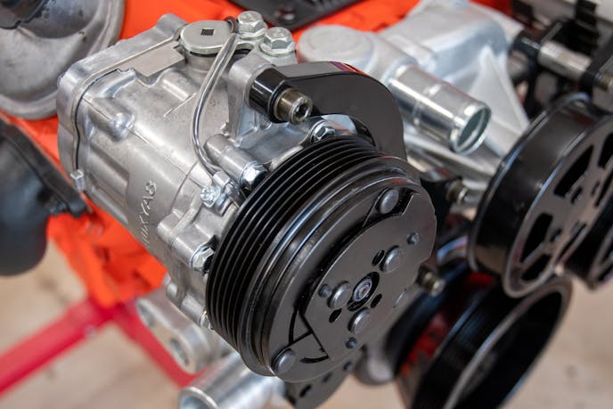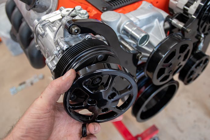 Our S-Drive system also included a Sanden-style compact A/C compressor, which bolted on effortlessly with the supplied brackets and hardware. The kit includes a billet front cover and a top plate for the unit. We did not install the top plate yet per the company’s instructions. This piece is not to be installed on the engine until you’re ready to attach the hoses and charge the system. So, we will wait until our vintage LS is in the vehicle.