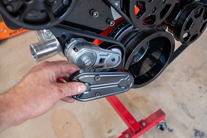 At this point, we have a few more things to finish before we button up the accessory drive. We went ahead and installed the crank pulley on the Super Damper, making sure to use the correct bolts and washers. We then mounted the tensioner and the cover before sliding the provided Gates belt into place.
