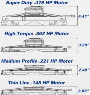 - Thin Line Motor – Ideal for when space is a problem, or to use as a helper fan, intercooler fan, or as an A/C condenser fan. This is company’s smallest, versatile fan.