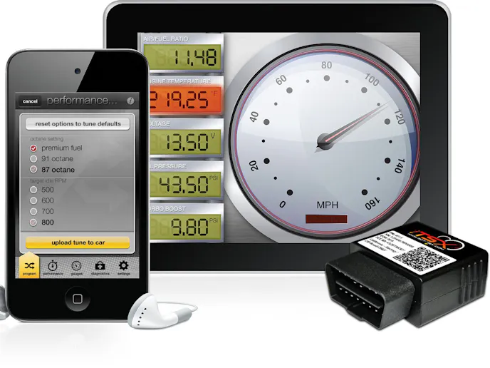 The iTSX re-calibrates the vehicle using bluetooth wireless. It is designed to work with iPod touch, iPad, iPhone and most popular Android devices. It is 50-state emissions legal and provides for monitoring popular sensor data via the analog input ports (optional analog input kit required).