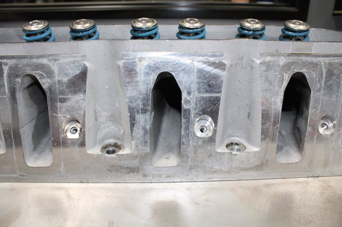 The intake port is designed with a cast ski jump on the port roof which is there to increase port flow velocity. Port flow was designed to be high in the .300-inch to .500-inch valve lift area to make power with relatively low-lift truck camshafts, whereas the old school Gen I heads liked higher-lift camshafts to make their power. The bowl area is wider around the valve guide–much wider than the old GM cast iron heads.