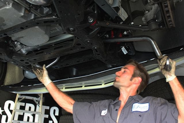 Once back at the shop, we loaded the Camaro up on the lift and set to work. We chose to start with the front sway bar. Looking through the instructions, Hellwig suggests that unbolting the motor mounts and slightly lifting the engine may be necessary when removing the old bar since there’s minimal room. But Signature’s technician, Josh, was feeling optimistic and decided he wanted to try it without doing so.