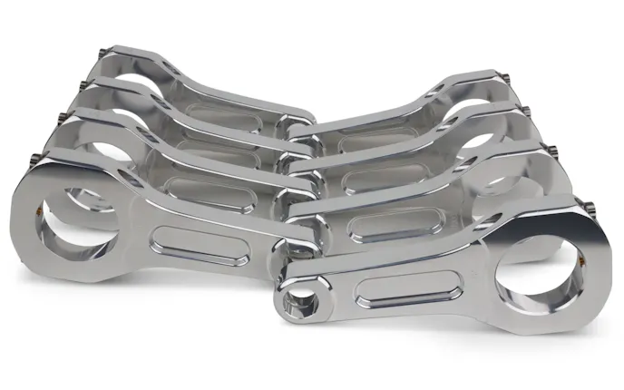 Instead of the typical forged steel, these are machined out of billet aluminum with a robust solid design resembling a support girder for a high-rise bridge. Measuring 6.185 inches in length, we needed the strength and weight savings an aluminum rod has to offer. On the big end, the MGP Pro 2500 series aluminum rods feature full radial serrations where the cap meets the body of the rod and custom-made ARP 7/16-inch rod bolts to ensure zero cap movement. The small end does not have a typical bronze bushing for the wrist pin, but a proprietary MGP “Hard Bore” process that provides a hardened surface of the aluminum in the bore for reduced wear and bore deformation.