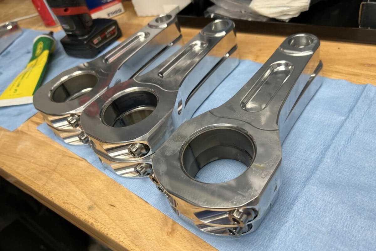 The OEM L8T connecting rods are surprisingly skinny, they have less material than a stock LT1 rod and a smaller-diameter wrist pin. At the end of the max effort naturally aspirated dyno testing, our L8T was pushing over 700 horsepower, and Brian Tooley advised that this was the upper limit for the stock connecting rods. Since we’re aiming to triple that power, we turned to MGP Connecting Rods for a set of Pro 2500 series aluminum rods.