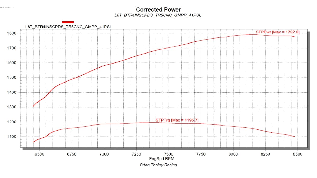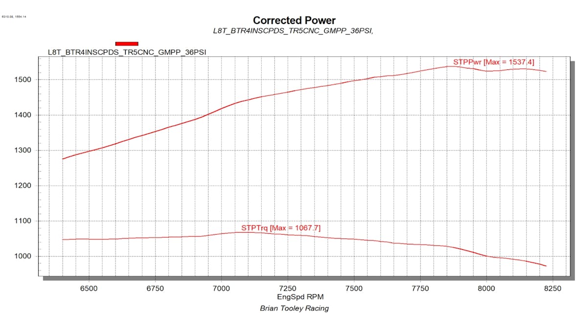 Going from the 1.40:1 gear set to 1.50:1 pushed the boost from 29.5 psi to 36.0 psi which allowed the 6.6 to make 1,537.4 horsepower at 7,800 rpm and 1,067.7 pound-feet of torque at 7,100 rpm. The L8T could live all season long at the dragstrip at this power level, but the team at BTR was now getting comfortable with tuning and was hungry for more boost and power.