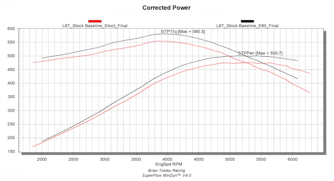 On 93 octane, our 6.6 made 476 horsepower and 554 pound-feet of torque. Simply switching it to E85 pushed it to 500 horsepower and 580 pound-feet of torque.