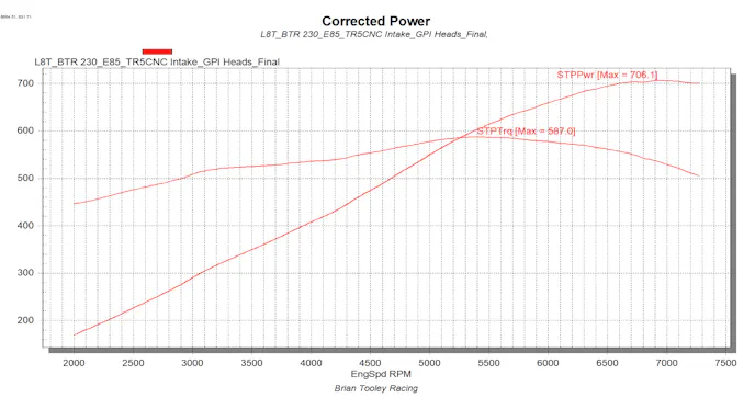 GPI’s Track Attack heads added 56 horsepower and 33 pound-feet of torque over the stock heads. New peak numbers came to 706 horsepower at 7,000 rpm and 587 pound-feet of torque at 5,400 rpm.