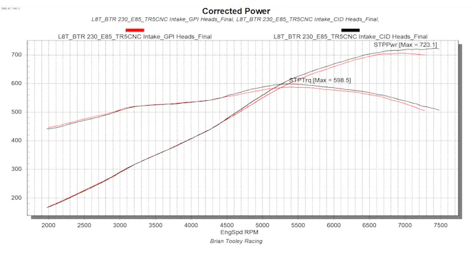 The final pull on our max effort naturally aspirated L8T dyno session with CID’s Gen-V LT cylinder heads came to 723 horsepower at 7,400 rpm and 598 pound-feet of torque at 5,400 rpm. It should be no surprise that the small bump in compression and the slightly higher flow at higher valve lifts helped it edge out the GPI heads in the higher rev range. What’s impressive is that both runs retained VVT, direct injection, and a hydraulic-roller valvetrain.