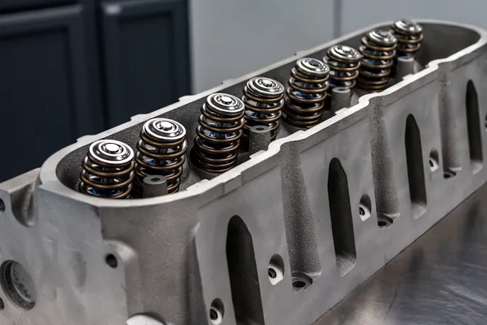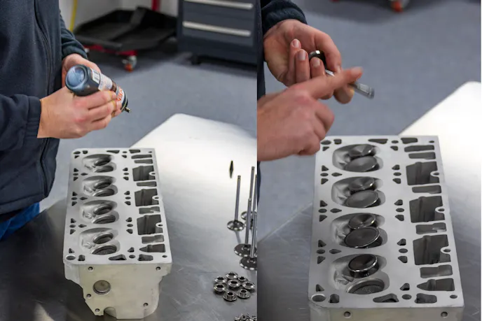 After all valves, springs, retainers, and locks are installed, the head undergoes a final inspection. Each spring is checked to confirm it is fully seated in its pocket. Each retainer is verified to be centered and flat. Lock engagement is inspected visually to ensure even seating in the valve stem grooves.
