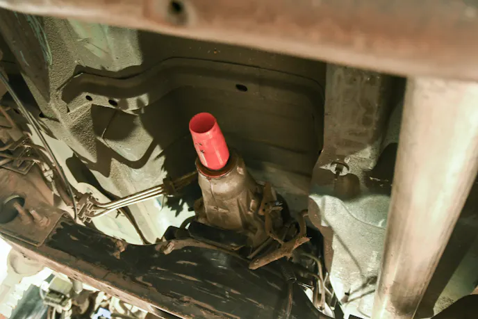 With the bell housing bolts in place, we then jacked the transmission into place before installing our new DTR Fab TH400 crossmember. We can now measure for a driveshaft to connect to our Moser Fab-9 rear axle.