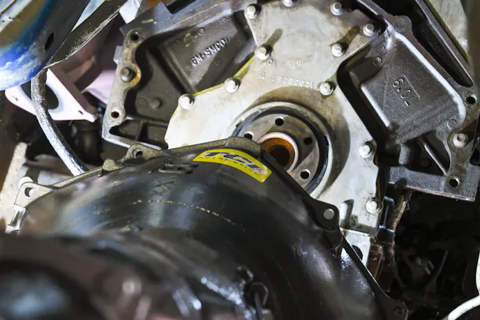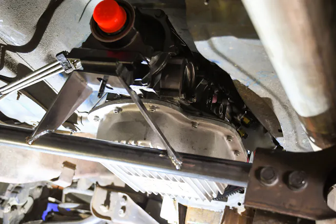 The next step was to remove the damaged 4L60e and replace it with our TCI three-speed unit. It’s wise to drain all of the transmission fluid at this time before removing the driveshaft. Next, you will need to remove the transmission dipstick, trans cooler lines, and starter before unbolting the torque converter. We then used a transmission jack and lowered the tail of the trans to allow easy access to the bell housing bolts. With all of the bolts removed, we carefully slid the 4L60e back and dropped the jack.