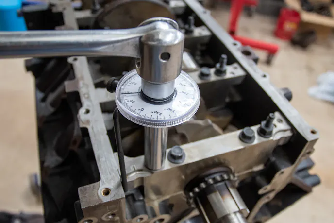 With the pistons in place, we first checked our rod bearing clearances again with Plastigauge. We then torqued the rod bolts to 15 lb-feet of torque and rotated the bolt 85-degrees since we had the second design rod bolts.