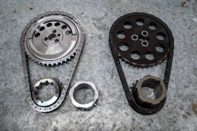 “Timing chains stretch over time, and the most significant risk would be chain breakage. A stretched chain can also affect the base timing, which can hurt performance,” Osterhaus explained. “Our performance timing set features superior materials, like billet steel instead of cast iron or powdered metal. Many will have a multi-key crank sprocket, heavy-duty seamless roller chains, and, depending on the set, a thrust bearing or washer.”