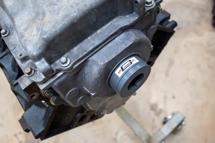 With the oil pan in place, we flipped over the engine and went to work on the front cover. We used a Mr. Gasket front cover gasket set (PN61015G), which includes the gaskets for front seal, front cover, and water pump gaskets. You should use a little bit of RTV silicone to seal the front cover off to ensure no leaks. We also used the Mr. Gasket front cover alignment tool (PN LSTC1) to straighten the cover before installing the harmonic damper.