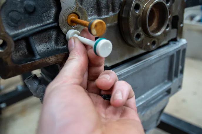 There are several ways to remove the plastic oil galley plug. We were able to pop ours out with a small screwdriver. If that doesn’t work, people have used pliers and even a self-tapping screw. With the OEM part out of the way, we put some oil on the o-ring and slid the new plug into place. Make sure the rounded end goes in first. We then put the rear cover on.