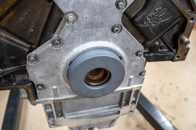 With the oil pan in place, we flipped over the engine and went to work on the front cover. We used a Mr. Gasket front cover gasket set (PN61015G), which includes the gaskets for front seal, front cover, and water pump gaskets. You should use a little bit of RTV silicone to seal the front cover off to ensure no leaks. We also used the Mr. Gasket front cover alignment tool (PN LSTC1) to straighten the cover before installing the harmonic damper.