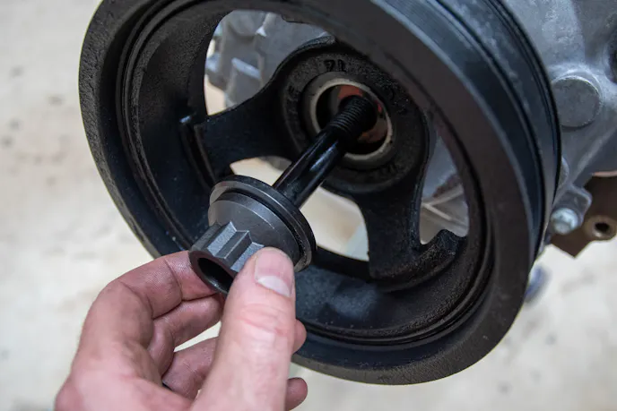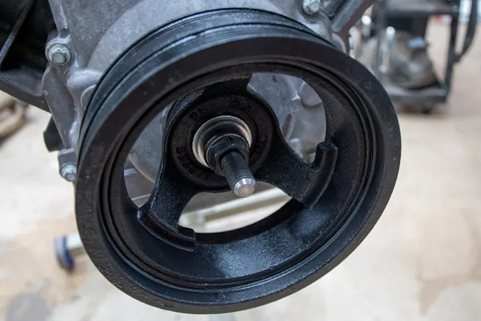 Before you install your damper, you will want to inspect the rubber insert for cracks and wear. Ours looked good, so we went ahead and installed it. To secure the damper, we used an ARP damper bolt, but first, we applied the ARP Ultra Torque Fastener Assembly Lubricant. After we threaded the bolt in by hand, we then torqued it to 235 ft-lbs as instructed. We recommend the use of a flywheel locking tool for this process.