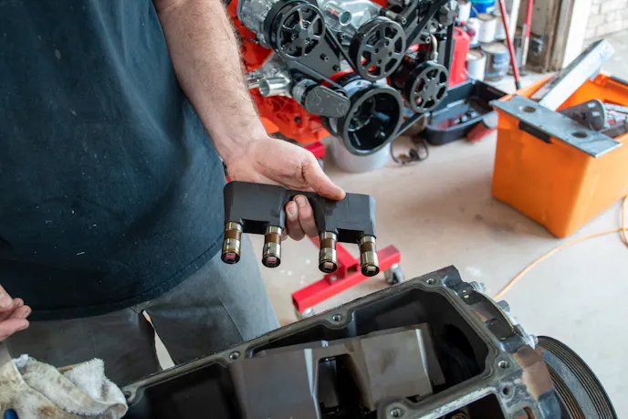 With our short block on the engine stand, we didn’t have room to get the plug out of the engine. So, we had to temporarily hang it from the engine hoist to do this process.